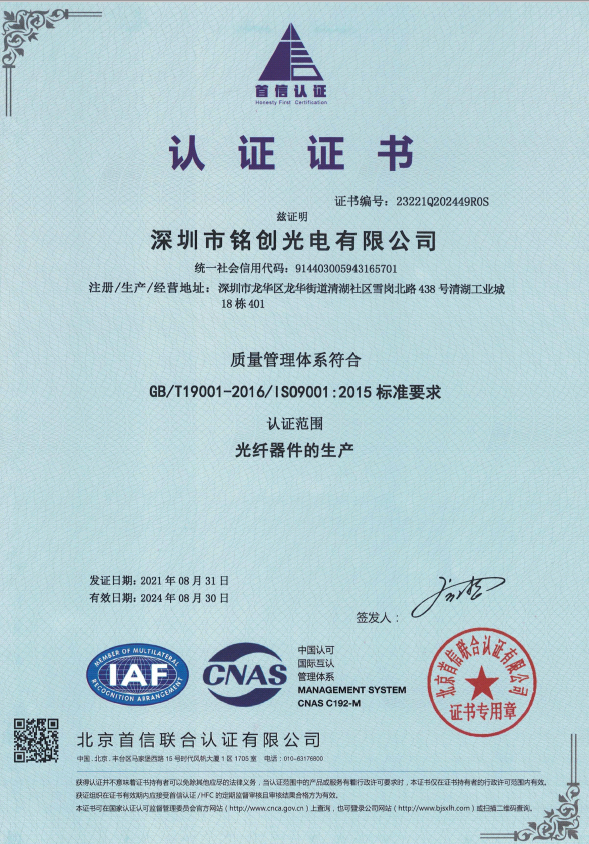 深圳市銘創(chuàng)光電有限公司于2012年成立,公司總部位于深圳市光明區(qū),是一家國家級高新技術(shù)企業(yè),通過了IS09001-2015質(zhì)量管理體系認(rèn)證和IS014001-2015環(huán)境管理體系認(rèn)證;經(jīng)過多年的持續(xù)研發(fā)投入和專注發(fā)展,銘創(chuàng)光電已逐漸成為光纖激光器、光纖傳感、激光雷達(dá)和激光通信等領(lǐng)域的綜合性產(chǎn)品服務(wù)商。 公司目前設(shè)立有光無源器件研發(fā)生產(chǎn)中心和激光研發(fā)生產(chǎn)中心。無源器件研發(fā)生產(chǎn)中心設(shè)有有高標(biāo)準(zhǔn)的無塵車間,可提供各種波長的無源光纖器件、高功率光纖器件、保偏光纖產(chǎn)品、超小型光纖器件。激光研發(fā)中心建立在安徽合肥市,研發(fā)生產(chǎn)特殊波長的激光光源、光纖激光器、光纖放大器以及新產(chǎn)品的技術(shù)研究儲(chǔ)備。研發(fā)生產(chǎn)中心與多地科研單位合作,能夠迅捷高效的為客戶提供相